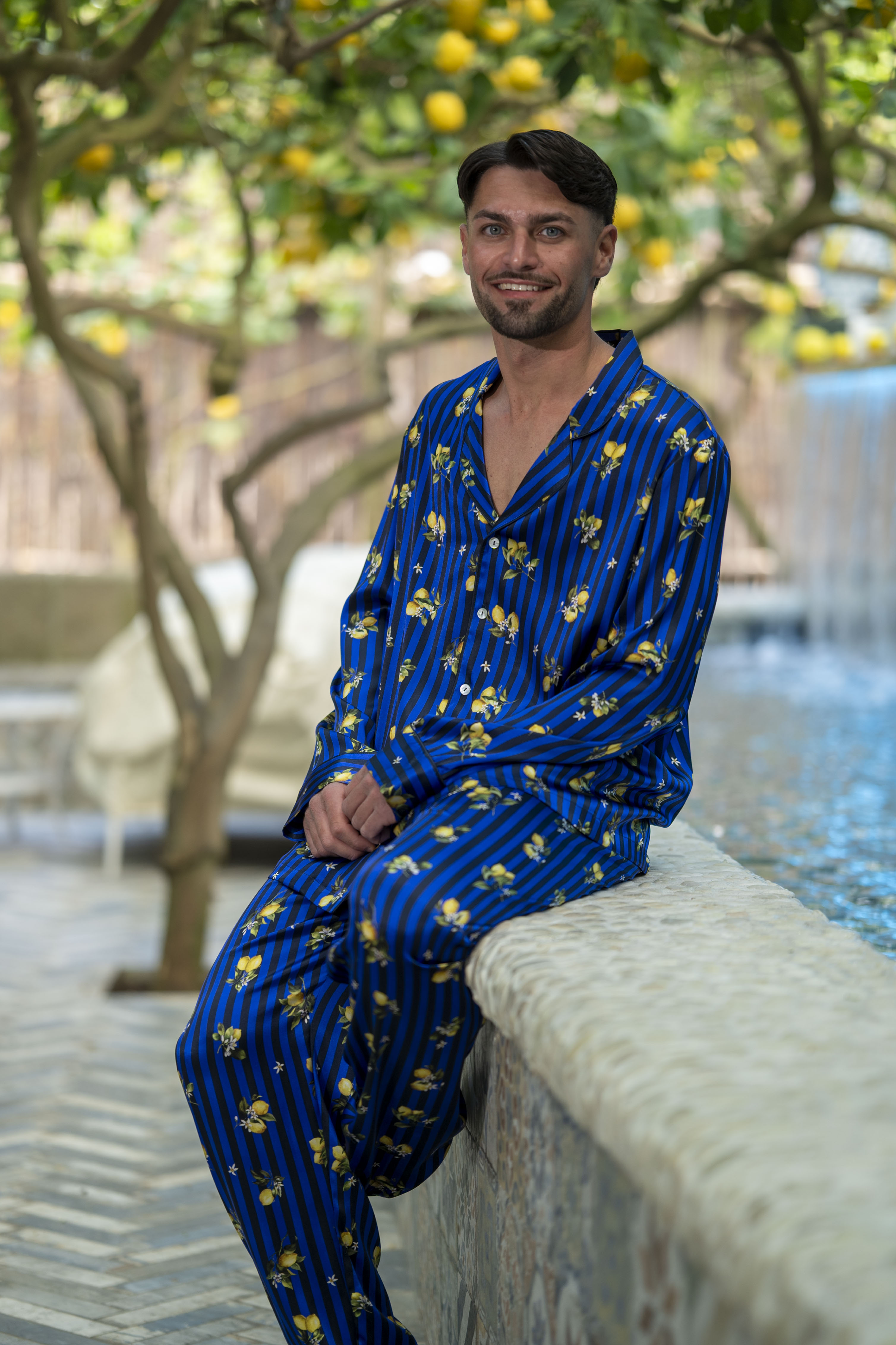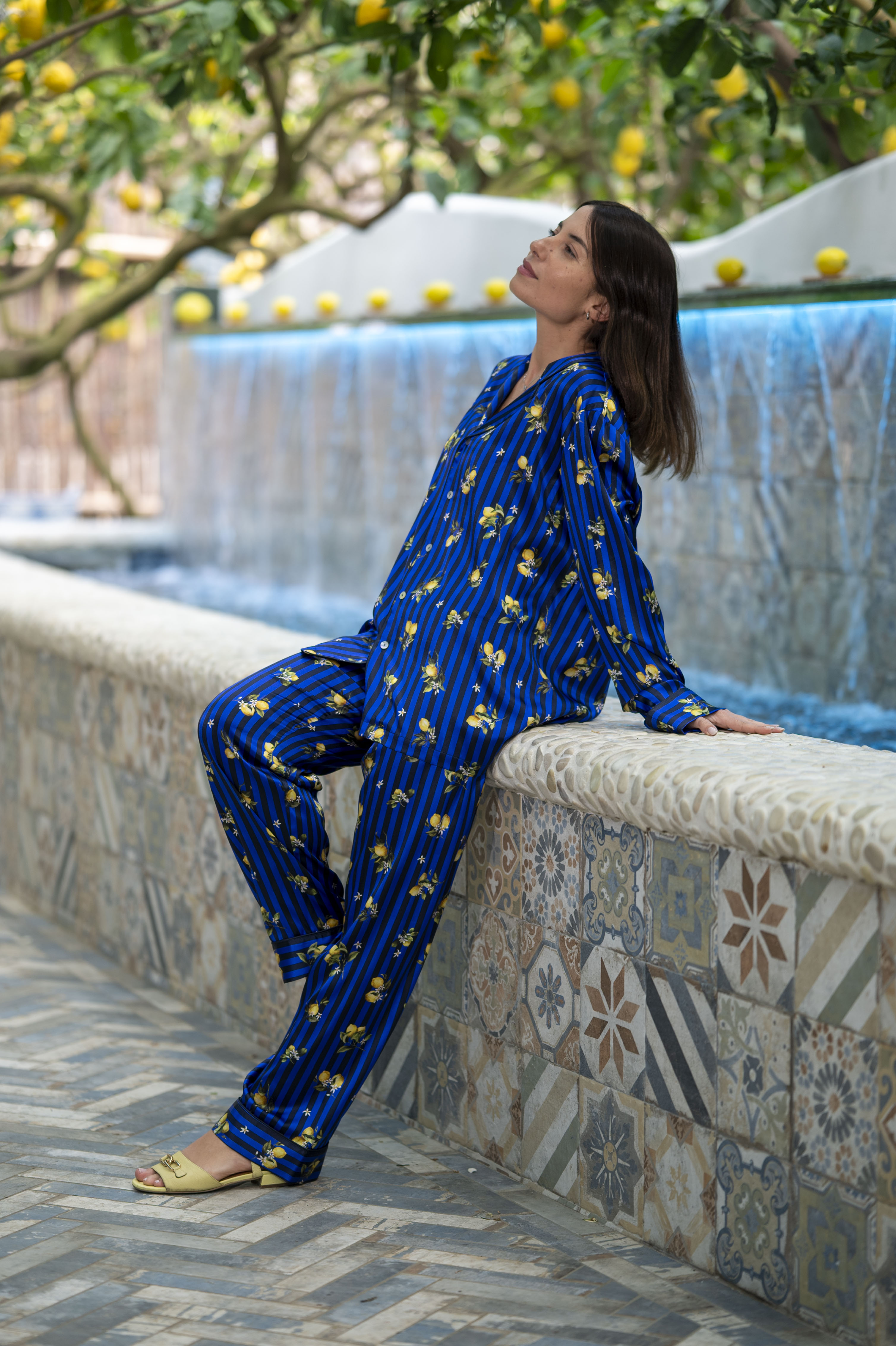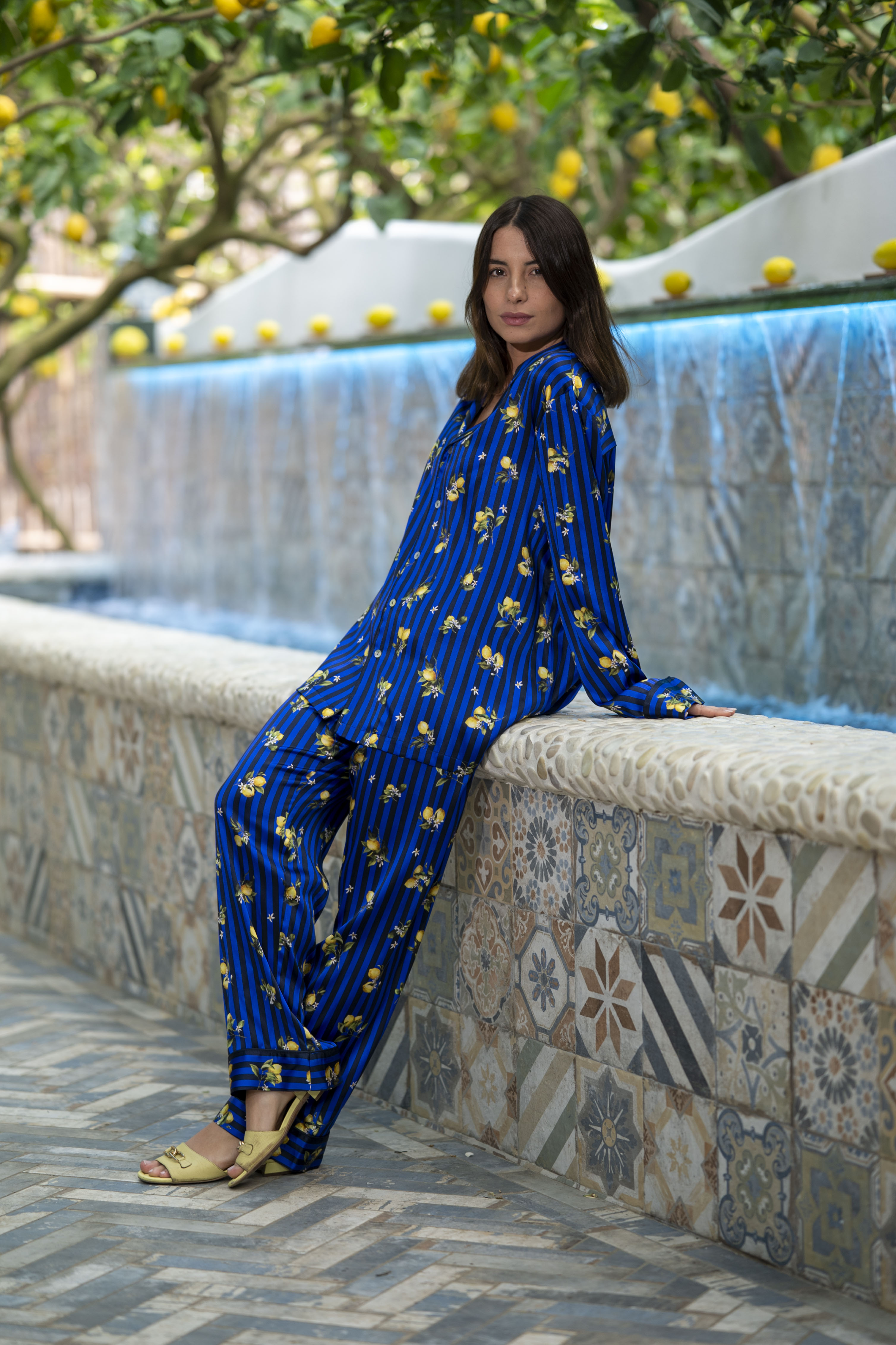 This silk two-piece features a long-sleeved button-down shirt with refined piping details and trousers. Designed by Blanche Capri Couture – luxury Capri’s tailoring brand – for Paolino Restaurant.
